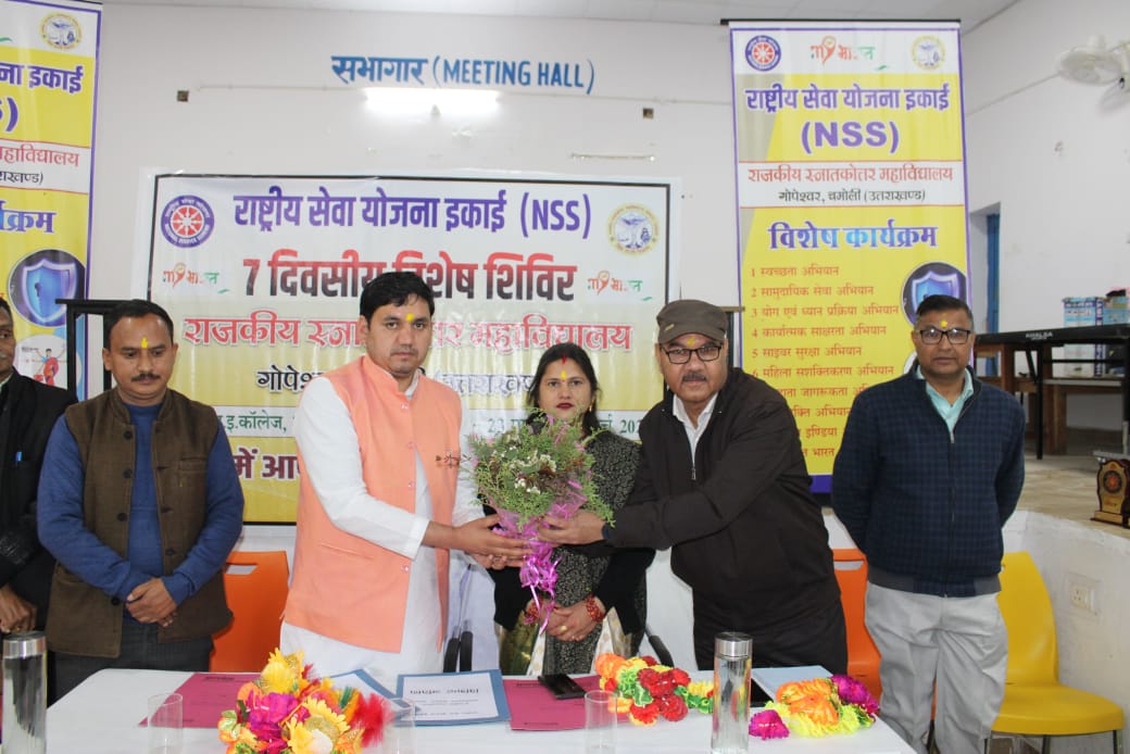 चमोली। आज दिनांक 23 मार्च 2026 को राजकीय स्नातकोत्तर महाविद्यालय गोपेश्वर चमोली की एनएसएस इकाई द्वारा सात दिवसीय विशेष शिविर का उद्घाटन किया गया। यह शिविर राजकीय इंटर कॉलेज माणा घिँघराण में दिनांक 23 मार्च से 29 मार्च, 2026 तक आयोजित किया जा रहा है। इस अवसर पर मुख्य अतिथि, जिला पंचायत अध्यक्ष चमोली दौलत सिंह बिष्ट ने कहा कि राष्ट्रीय स्वयंसेवा इकाई एक सामुदायिक सौहार्द, पारस्परिक सहयोग एवं समाज में एकजुटता व समरसता लाने के उद्देश्य से कार्य करती है। इन्हीं गुणो को युवाओं में विकसित करने हेतु इस प्रकार के शिविरों की एक महत्वपूर्ण भूमिका होती है। उन्होंने संपूर्ण उत्तराखंड को नशामुक्ति के बनाने लिए युवाओं को प्रेरित किया जिससे वह देश के विकास में अपना संपूर्ण योगदान दे सके।
