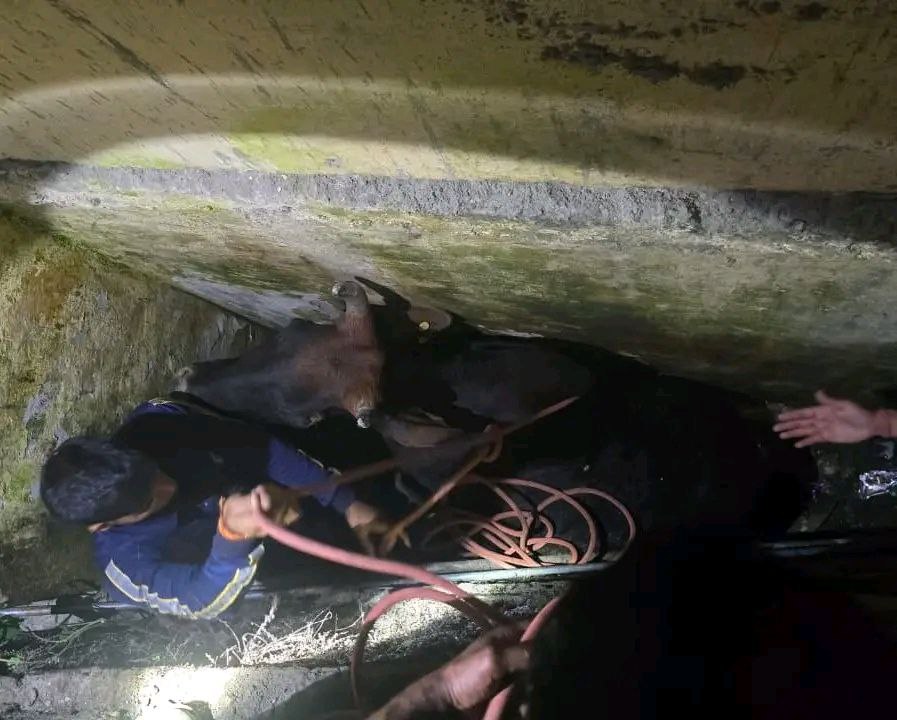 आज दिनांक 24 सितंबर, 2025 को सायंकाल, गोपेश्वर स्थित विकास भवन के पास एक हृदय विदारक दृश्य सामने आया, जब एक गाय एक संकरे और गहरे गड्ढे में फँसी पाई गई, जिससे उसकी जान को खतरा था। सूचना मिलते ही, प्रभारी अग्निशमन अधिकारी गोपेश्वर के नेतृत्व में फायर यूनिट बिना किसी विलंब के तत्काल घटनास्थल पर पहुँची। रेस्क्यू टीम ने अपनी कुशलता और अनुभव का परिचय देते हुए, रस्सियों और विशेष एनिमल रेस्क्यू बेल्ट की सहायता से घंटों की कड़ी मशक्कत के बाद, असहाय गाय को सुरक्षित रूप से गड्ढे से बाहर निकाला और उसे नया जीवन प्रदान किया। इस सफल बचाव अभियान में I/C LFM मदन सिंह, DVR नितिन जोशी एवं नरेश सिंह, तथा FM योगेश सिंह और यशवंत सिंह जांबाज अधिकारी और जवान शामिल थे, जिन्होंने टीम वर्क और समर्पण का उत्कृष्ट प्रदर्शन किया।